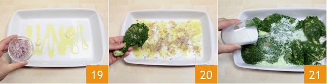 Vierte un chorrito de aceite en una bandeja amplia y coloca un diente de ajo pelado y cortado por la mitad y añade también la chalota que ya has picado finamente 19. Ahora coloca las piezas de pollo enharinadas y empanadas en la bandeja 20 y rocíalas con la leche para ablandarlas y que no se sequen durante la cocción 21. Puedes sustituir la leche también por caldo vegetal, descubre cómo prepararlo consultando nuestra Escuela de cocina:Caldo de verduras.