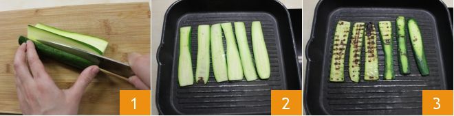 Para preparar el pollo en jaula, comienza con los calabacines: asegúrate de que sean bastante largos y anchos, de esta manera cubrirás la pechuga de pollo con más facilidad. Lávalos con cuidado, límpialos y corta 8 rodajas de un grosor de aproximadamente 2-3 mm a lo largo con un cuchillo o una mandolina 1. Pon a calentar una plancha y, una vez caliente, coloca las rodajas de calabacín 2. Cocina por ambos lados durante unos minutos, hasta que estén ligeramente tostadas y ablandadas 3.