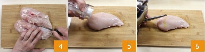 Ahora corta y deshuesa la pechuga de pollo: coloca la pechuga de pollo entera sobre una tabla de cortar y divídela por la mitad 4. Elimina el hueso en forma de y y palpa la zona del corte para comprobar que no queden más trozos de cartílago. Sala 5, pimienta y aceite 6 al gusto las pechugas de pollo por ambos lados.