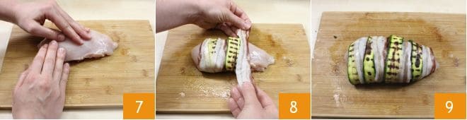 Masajea las pechugas de pollo con las manos para condimentar de manera uniforme la superficie 7. Luego envuelve las pechugas de pollo alternando las rodajas de calabacín a la plancha con rodajas de panceta 8. Orienta la parte más rosada de la panceta hacia el exterior, así las pechugas de pollo resultarán más coloridas. En total deberías usar aproximadamente 4 rodajas de calabacín y 4 rodajas de panceta. Cubre las pechugas de pollo por un lado y luego dobla hacia abajo las partes sobrantes, de modo que también cubras el otro lado 9. Se necesitarán rodajas de calabacín y panceta bastante largas, si por casualidad estas fueran más cortas, cubre primero un lado, gira la pechuga y cubre también el otro con otras rodajas.