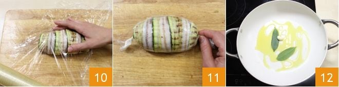 Envuelve las pechugas de pollo que has rellenado con papel film transparente 10, apretando bien el papel en los lados como un caramelo 11. Esta operación ayudará a dar a las pechugas una forma cilíndrica. Luego transfiérelas al refrigerador y déjalas reposar durante 1 hora. Una vez envueltas en el film, puedes dejar reposar las pechugas de pollo incluso toda la noche, así podrás prepararlas la noche anterior para el día siguiente, de esta manera el pollo tomará una forma más regular. Transcurrido este tiempo, toma una sartén grande, vierte un poco de aceite y dora un diente de ajo pelado con un par de hojas de laurel 12.