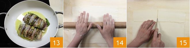 Una vez dorado el ajo, saca del refrigerador las pechugas de pollo que habías puesto a reposar, quita el film y dóralas en la sartén por ambos lados a fuego lento durante unos 20 minutos 13. Cuando estén cocidas, deja enfriar las pechugas de pollo sobre una rejilla, para que escurra el exceso de aceite. Mientras tanto prepara la jaula: toma un rollo de hojaldre rectangular ya listo, colócalo sobre una superficie enharinada y trabaja brevemente con el rodillo 14. Luego corta 1/3 a lo largo y divide la pieza por la mitad, para obtener 2 rectángulos, que servirán como base para la jaula 15.