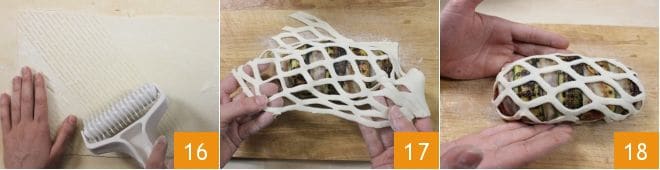 Corta el resto del hojaldre con la rueda especial para rombos, después de haber pasado el rodillo en la harina 16 o si no tienes la herramienta, puedes hacer tiras de hojaldre de aproximadamente medio cm de ancho y cruzarlas sobre el pollo como se hace con una tarta. Luego coloca la pechuga de pollo rellena sobre la base de hojaldre, bate un huevo y, ayudándote con un pincel, unta los bordes de la base. Luego abre suavemente con las manos la red de hojaldre que has creado, cubriendo las pechugas de pollo 17. Finalmente, dobla los bordes de la red sobrantes hacia la base, sellando bien la "jaula" 18.