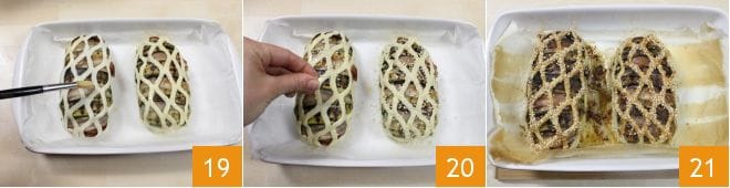 Coloca las pechugas de pollo en jaula en una bandeja rectangular que hayas cubierto con papel de horno y unta ahora la superficie con el huevo batido 19. Espolvorea la jaula con semillas de sésamo blanco 20 y hornea en horno estático precalentado a 200° durante unos 40 minutos. Cuando la superficie esté bien dorada 21, déjala entibiar ligeramente y luego córtala en rodajas. ¡Tu pollo en jaula está listo para ser servido y disfrutado incluso frío, quizás acompañado de mostaza o de nuestra falsa mayonesa!