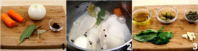 Para preparar el pollo en salsa verde, comienza pelando una cebolla y pelando y cortando por la mitad una zanahoria 1. Colócalas en aproximadamente 1,5 litros de agua y añade las hojas de laurel y los granos de pimienta. Añade sal y lleva a ebullición. Baja el fuego y coloca las pechugas de pollo para hervir 2, deberán cocinarse entre 10 y 20 minutos dependiendo del grosor de la carne, que deberá quedar completamente blanca pero aún bastante tierna. Mientras tanto, dedícate a la preparación de la salsa. En un procesador, pica las aceitunas, las alcaparras, la albahaca, el ajo y el perejil 3.