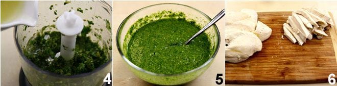Añade 3 cucharadas de aceite y un chorrito de zumo de limón y mezcla todo 4. Ajusta si es necesario con sal y si la salsa verde resulta demasiado densa, añade al gusto un poco más de aceite, un poco de zumo de limón o un poco de agua 5. Escurre las pechugas de pollo (puedes guardar el caldo para otras preparaciones), déjalas enfriar un poco y córtalas en tiras regulares 6.