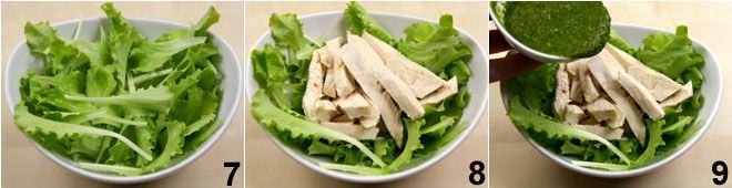 Pon lechuga en un bol 7, añade las tiras de pechuga de pollo 8 y sazónalas con la salsa verde obtenida 9. El pollo en salsa verde también se puede servir con patatas hervidas.