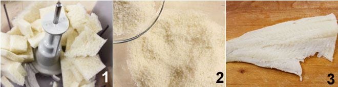 Para preparar las albóndigas de bacalao, lo primero es desalar el bacalao enjuagándolo bien bajo el agua corriente y colocándolo en remojo durante dos días en agua fría, cambiando el agua al menos dos veces al día. Mientras tanto, coloca en una batidora la miga de pan 1, tritúrala finamente y ponla en un bol 2. Pasados los dos días, seca bien el bacalao 3
