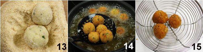 luego por el huevo batido y finalmente por el pan rallado 13. Fríe las albóndigas en aceite de semillas bien caliente 14. Cuando las albóndigas estén doradas, escúrrelas con la ayuda de una espumadera y colócalas sobre papel absorbente 15 para que pierdan el exceso de aceite.