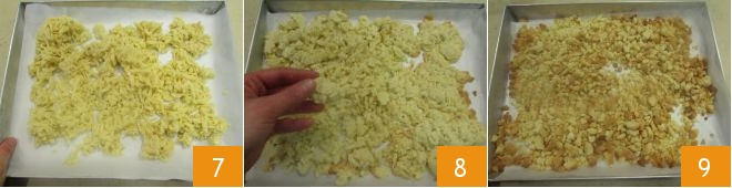 Distribuid la masa rallada en la bandeja 7 y hornead durante 20 minutos. Transcurridos los 20 minutos, sacad la bandeja del horno, desmenuzad ligeramente la masa cocida con las manos 8 y volved a hornear durante otros 10 minutos, para que el crumble se dore bien. Una vez cocido, dejad que se temple 9 y, una vez tibio, desmenuzadlo aún más con las manos.