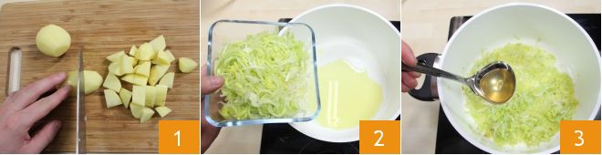 Para preparar el Potage Parmentier, pele, lave y corte groseramente las patatas 1 y en rodajas los puerros. Sofría los puerros en una sartén antiadherente con 3 cucharadas de aceite durante unos minutos 2, luego añada un cucharón de caldo y déjelos pochar durante 5-6 minutos 3.