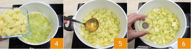 Añada las patatas 4 y cubra las verduras al ras con el caldo restante 5. Ajuste de sal y pimienta y continúe la cocción a fuego moderado, el tiempo necesario para que las patatas se vuelvan blandas (tomará unos 15/20 minutos, dependiendo del tipo de patata).