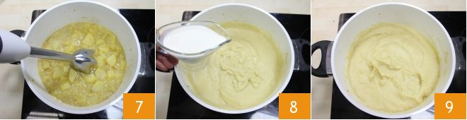 Una vez cocido, triture todo utilizando una batidora de mano 7, añada la nata 8 y mezcle con cuidado para amalgamar todos los ingredientes. Cocine la crema 5 minutos más, luego apague el fuego y sirva el Potage Parmentier cuando todavía esté caliente, quizás acompañándolo con unas rebanadas de pan tostado y un espolvoreado de queso parmesano rallado.