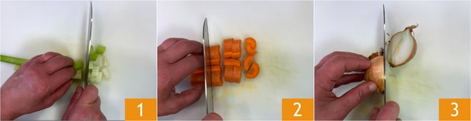 Para preparar el pulpo a la gallega, primero corta el apio 1 y las zanahorias 2 en trozos. Corta la cebolla por la mitad 3.