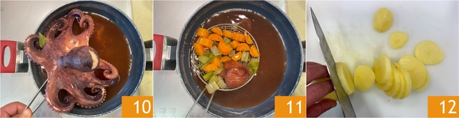 Escurre el pulpo 10 y las verduras 11 y deja enfriar completamente. Mientras tanto, pela las patatas y córtalas en rodajas de medio cm 12.