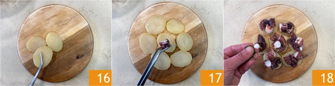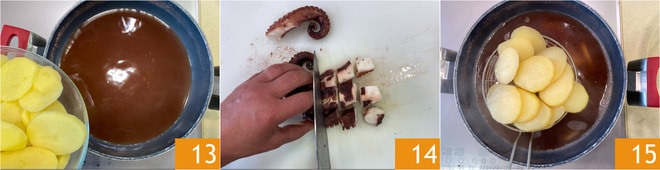 Hierve las patatas en el agua de cocción del pulpo 13 hasta que estén blandas pero firmes. Mientras tanto, corta el pulpo en trozos 14. Escurre las patatas 15.
