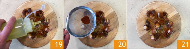 Completa con un hilo de aceite 19 y espolvorea con pimentón dulce 20. El pulpo a la gallega está listo para ser disfrutado 21.