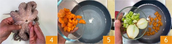 Lava bien el pulpo, luego límpialo vaciando bien la cabeza y eliminando los ojos y el pico central 4. En una olla grande vierte agua, añade las zanahorias 5, el apio y la cebolla 6.