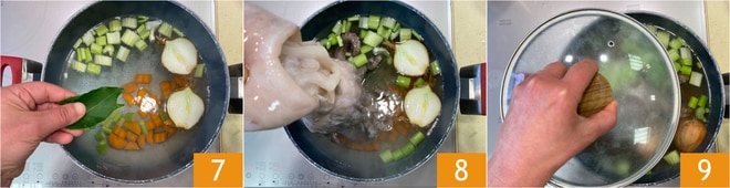 Añade dos hojas de laurel 7 y lleva a ebullición. Luego sumerge el pulpo y levántalo 3-4 veces 8 o hasta que los tentáculos se hayan rizado. Luego sumérgelo completamente; cubre con una tapa 9 y cocina durante 40-50 minutos, el pulpo debe quedar tierno.
