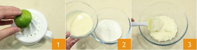 Para realizar los quindim brasileños exprime el jugo del limón 1, coloca la harina de coco en un bol, añade la leche condensada 2 y mezcla con una espátula para integrar los ingredientes 3.