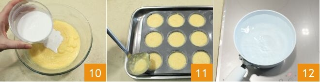 Retoma la masa y vierte por último la leche de coco 10, mezcla para integrar los ingredientes y luego vierte la mezcla en el molde ayudándote con un cucharón 11. Calienta agua en un cazo 12