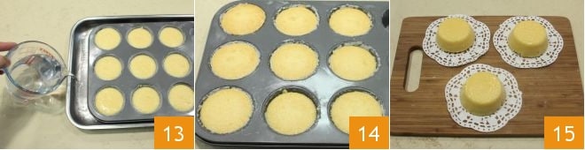 y viértela en la bandeja grande 13 que contiene el molde, el agua debe cubrir dos tercios de los moldes. Hornea en horno estático precalentado a 180°C durante 40 minutos (o horno ventilado a 160°C durante 30 minutos). Una vez cocidos, saca tus quindim 14 y déjalos enfriar antes de desmoldarlos, volteando el molde sobre una bandeja. Los quindim brasileños están listos para ser disfrutados 15.