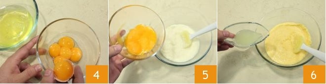 Separa las claras de las yemas 4 e incorpora estas últimas a la mezcla 5. Vierte también el jugo de limón 6 y la leche de coco. Mezcla con una espátula la mezcla para integrar los ingredientes