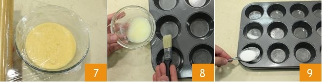 luego cubre con film transparente 7 y deja reposar durante 15 minutos. Mientras tanto, engrasa un molde de cupcakes 8 y espolvorea con azúcar granulada 9 e introdúcelo dentro de una bandeja más grande, servirá para la cocción al baño maría.