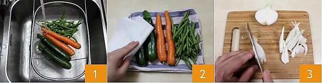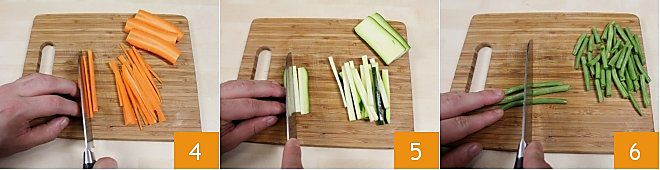 Pela la zanahoria con un pelador, divídela por la mitad y córtala a lo largo y finalmente forma unas tiras 4. Toma el calabacín y, sin pelarlo, córtalo en tiras como la zanahoria 5. Después de cortar por la mitad las judías verdes 6, reserva las verduras en unos boles pequeños.
