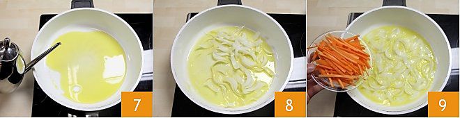 Vierte el aceite de oliva virgen extra en una sartén antiadherente 7 y cuando el aceite esté bien caliente, añade la cebolleta fresca cortada en gajos 8. Cocina durante 5-6 minutos a fuego medio, añadiendo un poco de agua para que se ablande, luego añade las zanahorias y cocínalas durante otros dos minutos solo con la cebolleta 9.