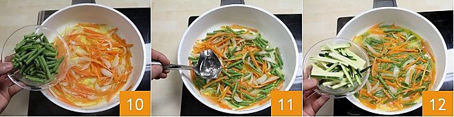 Añade las judías verdes 10, sala y pimienta al gusto. Añade más agua para facilitar la cocción 11 y cocina a fuego moderado durante 6 minutos, luego añade los calabacines 12.