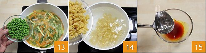 Finalmente añade los guisantes 13 y sala y pimienta nuevamente. Deja cocer las verduras durante unos 15 minutos a fuego bajo, hasta que se ablanden. A este punto, hierve agua en una olla y una vez alcance el hervor, vierte los radiadores 14, cocínalos durante unos 9 minutos. Mientras tanto, toma un bol pequeño, vierte en él el sobre de azafrán y añade un poco de agua de cocción 15.