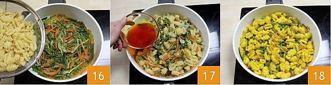 Una vez que los radiadores estén cocidos, escúrrelos y viértelos en la sartén con las verduras 16, mezcla todo, haciendo que la pasta se integre con las verduras. Justo después añade el azafrán disuelto en el agua de cocción que habías preparado 17 y mezcla. Ahora tus radiadores con verduras y azafrán están listos 18 para ser emplatados, servidos y disfrutados!