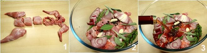 Eliminad la cabeza, las vísceras y cualquier rastro de grasa del conejo, luego lavadlo bajo agua fría y cortadlo en trozos 1. Colocad los trozos de conejo en un recipiente junto con las bayas de enebro, los granos de pimienta, dos dientes de ajo, media cebolla, una ramita de romero, las hojas de laurel y de salvia 2, luego cubrid todo con el vino tinto 3 y dejad macerar por al menos dos horas en un lugar fresco (o toda la noche en la nevera).