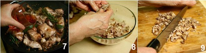 Añadid un vaso de vino tinto 7 y dejad que se evapore, luego sal, añadid otro vaso de vino y cubrid el conejo con una tapa, dejándolo cocinar a fuego lento hasta que se deshaga, añadiendo caldo caliente cuando sea necesario hasta el final de la cocción. Dejad que el conejo se temple, luego, usando las manos, deshuesad toda la carne 8 (¡operación mucho más sencilla cuando el conejo está cocido!), picadla con un cuchillo 9 y unidla a su fondo de cocción en la cacerola 10.