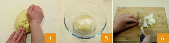 y manéjala unos minutos sobre una superficie de trabajo ligeramente enharinada 4. Luego cúbrela con film transparente y déjala reposar al menos 30 minutos en un lugar fresco 5. Mientras tanto, dedícate al relleno: pela y pica finamente una cebolla 6;