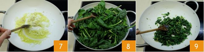 sofríela en una sartén con un chorrito de aceite y 15 g de mantequilla 7. Cuando esté pochada, agrega las espinacas previamente lavadas 8 añade muy poca agua y déjalas cocinar con la tapa durante unos minutos. Al final de la cocción estarán pochadas 9, deja que se sequen, luego apaga el fuego.
