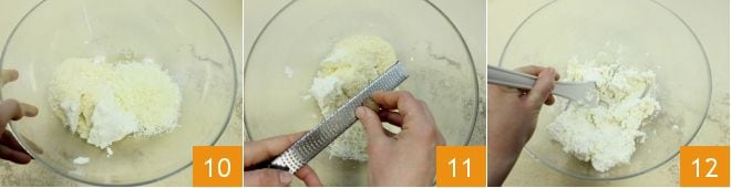 En un bol, vierte la ricotta, los quesos rallados 10 y una ralladura de nuez moscada 11. Luego mezcla todo con una espátula 12.