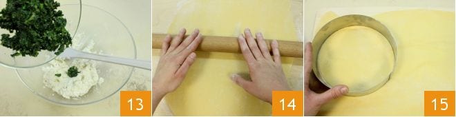 Al relleno de quesos añade también las espinacas cocidas y picadas 13, ajusta de sal y pimienta y mezcla todo cuidadosamente (para realizar el relleno también puedes usar una batidora, triturando juntos todos los ingredientes). Ahora toma la pasta fresca, extiéndela en una hoja delgada de unos milímetros ayudándote con un rodillo largo: la masa resultará bastante elástica, por lo que puedes sujetar un extremo con la mano y con la otra hacer deslizar el rodillo sobre la pasta. Estírala bien en todas las direcciones hasta obtener una hoja delgada 14. Recorta 8 discos con un cortador de pasta (o alternativamente siguiendo el contorno de un cuenco) de 18 cm de diámetro cada uno 15.
