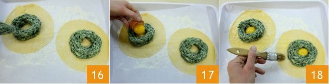 Una vez obtenidos los discos de pasta, transfiere la mezcla de espinacas y ricotta a una manga pastelera y para cada uno de los 4 discos realiza dos espirales de mezcla 16. En el centro de cada espiral, coloca una yema 17 reservando la clara que servirá para pincelar los bordes de los 4 discos rellenos 18.