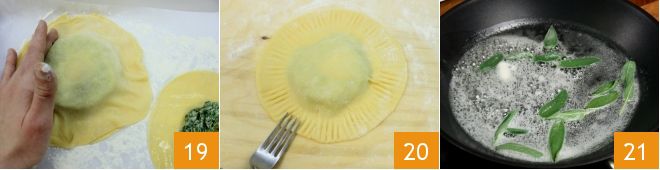 Sobre cada disco relleno, coloca otro y presiona suavemente en los bordes para sellarlos 19. Luego decora con los dientes de un tenedor delicadamente alrededor de los bordes 20. Coloca los raviolones sobre un paño de cocina enharinado y mientras tanto haz hervir abundante agua en una olla grande de bordes altos. Mientras tanto, en una sartén derrite la mantequilla y añade las hojitas de salvia 21.