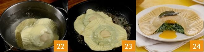 Cuando el agua comience a hervir, sumerge delicadamente los raviolones, dos a la vez 22; déjalos cocinar solo un par de minutos, luego escúrrelos y saltéalos en la sartén con mantequilla y salvia 23. Una vez sazonados, coloca un raviolón en cada plato de servir y decóralo con una hojita de salvia 24; también puedes condimentarlo con una pizca de Grana Padano antes de servirlo bien caliente a tus comensales!