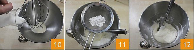 Mientras se cuece la tarta, proceda a montar la nata para la decoración: vierta la nata líquida en un bol 10 y tamice el azúcar glas 11. Monte la nata para decorar la cheesecake 12. Para este paso, puede consultar la guía de cocina: cómo montar la nata.