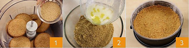 Para preparar la cheesecake de Red Velvet, comience preparando la base: coloque las galletas Digestive en el procesador junto con el azúcar moreno 1, luego tritúrelas finamente. Derrita la mantequilla en un cazo a fuego lento; mientras tanto, coloque las galletas trituradas en un bol y añada poco a poco la mantequilla derretida 2; luego mezcle bien el compuesto. Engrase un molde, preferiblemente desmontable, de 22 cm de diámetro; corte un disco de papel de hornear del mismo diámetro de la base del molde y dos tiras de la misma altura de los bordes, luego forre el molde. Para esta operación puede consultar la guía de cocina: cómo forrar un molde con papel de horno. Ahora, vierta las galletas trituradas en el molde forrado con papel de horno y con el dorso de una cuchara compacte bien la base de galleta 3. Refrigere el compuesto en la nevera durante 30 minutos o en el congelador durante unos 10-15 minutos.
