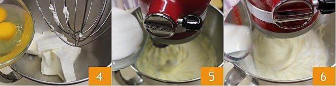 A continuación, puede proceder a preparar la crema: coloque en un bol grande el queso y los dos huevos 4, active las varillas para mezclar el compuesto y luego agregue el azúcar 5. Si no tiene una planetaria, puede trabajar los ingredientes en un bol grande con una batidora eléctrica o un batidor manual. Agregue el extracto de vainilla e incorpore también la nata fresca líquida a hilo 6 continuando a mezclar.