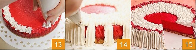 Ahora puede proceder a decorar la tarta: una vez terminado el tiempo de cocción, saque la cheesecake del horno y desmóldela en un plato de servir. Déjela enfriar; mientras tanto, llene una manga pastelera con boquilla de estrella con la nata previamente montada e inicie a adornar su cheesecake de Red Velvet con rosetones de nata montada a lo largo de la circunferencia de la tarta y casi hasta el centro, decorando también los bordes (13-14). Puede finalizar la decoración a su gusto, por ejemplo, con granillo de azúcar de colores para dar un contraste rojo vivo a su cheesecake de Red Velvet 15.