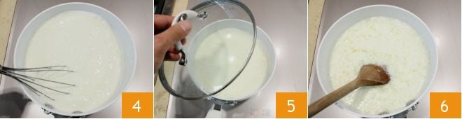 remuevan durante unos segundos con una batidora 4 y cubran con una tapa 5. Después de 10 minutos, rompan la cuajada que se habrá formado con una cuchara de madera 6 o con la batidora.