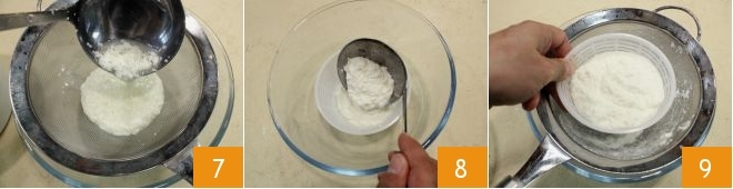 Esperen unos minutos, luego comiencen a verter un cucharón de cuajada en un colador colocado sobre un bol 7 para recoger el suero. Dejen escurrir la cuajada unos segundos y transfiéranla escurrida a un molde para ricotta 8. Continúen de este modo hasta agotar la cuajada. Una vez llena completamente, pongan el molde a escurrir sobre el colador 9, cubran con un paño y metan en el frigorífico durante unas 3 horas. Su ricotta estará lista en cuanto empiece a solidificarse en el molde.