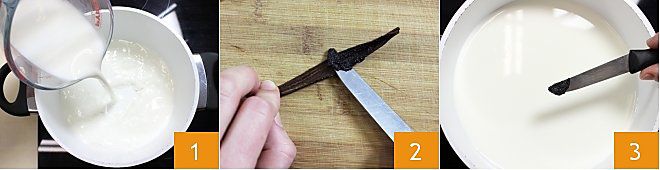 Para preparar el arroz con leche, calienta la leche en una cacerola de bordes altos a fuego medio 1, con un cuchillo haz un corte a una vaina de vainilla y extrae las semillas deslizando la hoja del cuchillo a lo largo del interior de la vaina 2. Agrega la mitad de la vaina y las semillas en la leche 3.