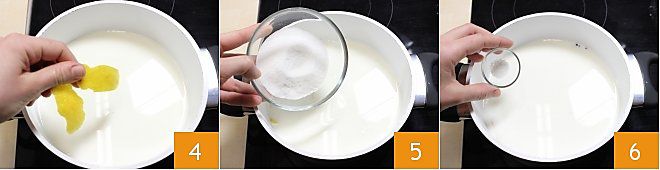 Lava un limón y saca la cáscara y agrégala a la leche 4. Luego, vierte también el azúcar granulado 5 y la sal 6.